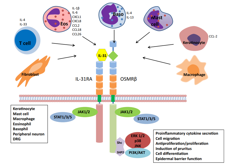 IL-31(白細(xì)胞介素31)于2004年被Dillon等人發(fā)現(xiàn),是一種四螺旋束細(xì)胞因子,有2個長螺旋和2個短螺旋,屬于糖蛋白130 (gp130)/IL-6細(xì)胞因子家族。IL-31最初被證明是由激活的輔助T細(xì)胞產(chǎn)生的,尤其是Th2細(xì)胞、肥大細(xì)胞、巨噬細(xì)胞和樹突狀細(xì)胞,此外在嗜酸性粒細(xì)胞、嗜堿性細(xì)胞等中也有IL-31的表達(dá)。IL-31與瘙癢感覺神經(jīng)纖維表面IL-31RA亞基結(jié)合,激活OSMR亞基發(fā)生異構(gòu),主要通過磷脂酰肌醇30-激酶/蛋白激酶(PI3K/AKT)通路、Janus激酶/信號轉(zhuǎn)換器和轉(zhuǎn)錄激活因子(JAK/STAT)通路及絲裂原激活的蛋白激酶(Ras/Raf/MAPK)通路。IL-31信號通路的下游轉(zhuǎn)錄因子的激活會參與不同的基因表達(dá),比如炎癥、遷移、分化、(抗)增殖、細(xì)胞存活和屏障功能等。