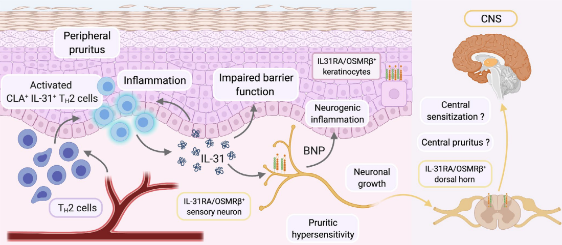 CLA T2細(xì)胞是特應(yīng)性皮炎(AD)患者循環(huán)中豐富的過敏原反應(yīng)性T細(xì)胞,通過CCL17和CCL22信號被募集到AD感染的皮膚。在皮膚中,CLA T2細(xì)胞分泌IL-31,進(jìn)而激活表達(dá)IL31RA/ OSMR β-的皮膚感覺神經(jīng)、天然免疫細(xì)胞(包括DC)、單核細(xì)胞和嗜酸性粒細(xì)胞以及角質(zhì)形成細(xì)胞。在AD皮膚中,角質(zhì)形成細(xì)胞顯示IL31RA/OSMRβ表達(dá)水平升高,導(dǎo)致對IL-31的接受性增強(qiáng)。皮膚IL-31信號通過IL-31介導(dǎo)的終分化基因(如聚絲蛋白和脂質(zhì)包膜減少)的抑制,導(dǎo)致外周瘙癢、(神經(jīng))炎癥和屏障功能受損?;罨慕琴|(zhì)形成細(xì)胞分泌各種化學(xué)引誘劑,觸發(fā)表達(dá)IL -31的CLA Tu2細(xì)胞額外募集到炎癥部位,形成皮膚炎癥和瘙癢的反饋循環(huán)。人和犬的感覺神經(jīng)元表達(dá)IL31RA/ OSMRβ主要在TRPV1共表達(dá)的神經(jīng)元中。IL-31與IL31RA/ OSMR β結(jié)合后,通過下游信號通路上調(diào)瞬時受體電位香草酸受體1(tansient receptor potential vanilloid,TRPV1)及瞬時受體電位受體A1(TRPA1)表達(dá),增強(qiáng)神經(jīng)元興奮性,促進(jìn)晚期及慢性瘙癢形成。
