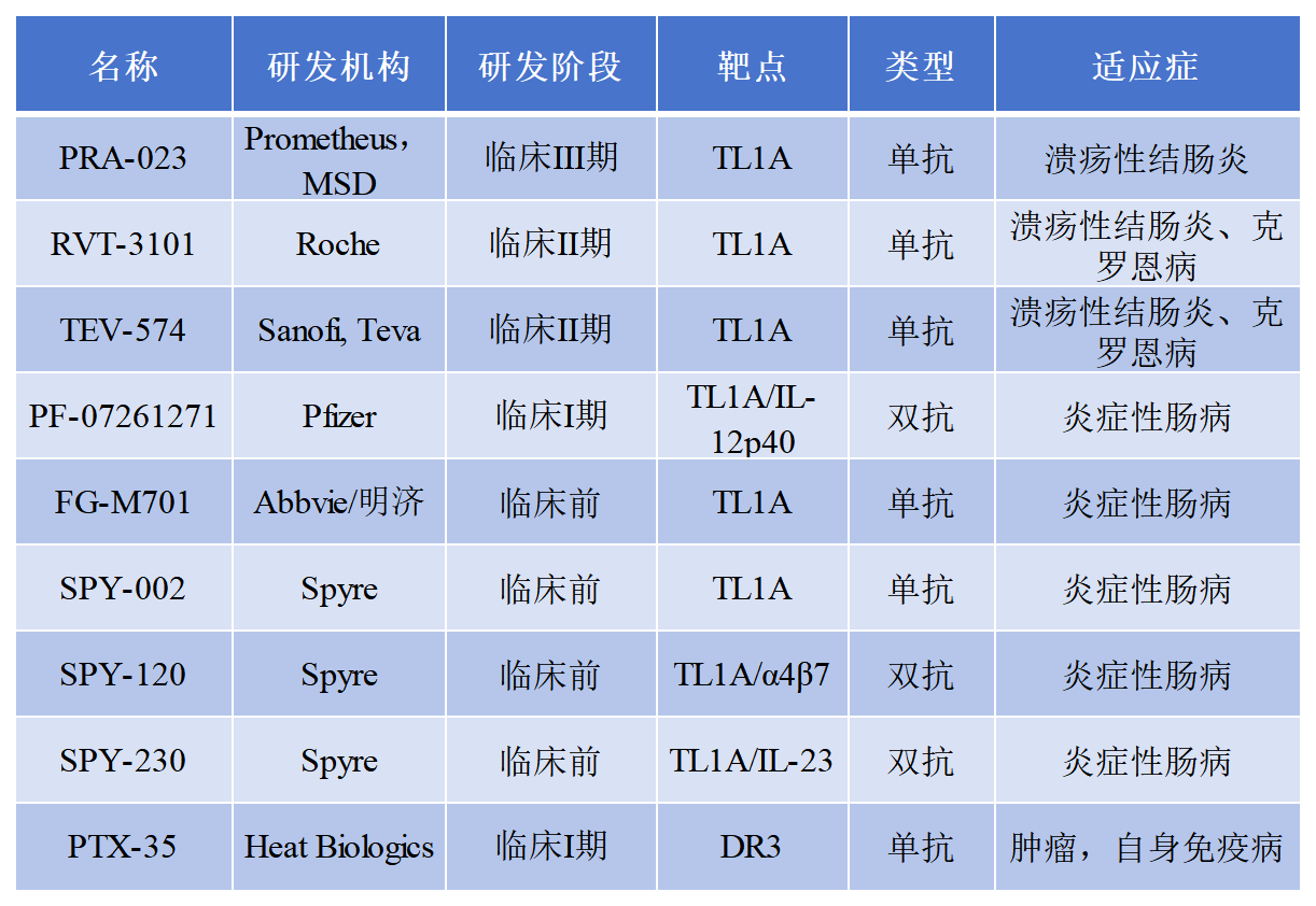 2023年10月23日,羅氏宣布收購Telavant,獲得其在研核心產(chǎn)品TL1A抗體RVT-3101,因此越來越多的藥企布局TL1A/DR3藥物的研發(fā)。目前關于TL1A靶點,在研藥物有單抗也有雙抗,主要針對克羅恩病、潰瘍性結(jié)腸炎等IBD疾病。關于DR3靶點,目前就只有PTX-35在研。