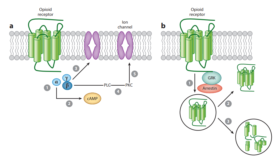 早期阿片受體藥理學(xué)研究表明,鳥(niǎo)嘌呤三磷酸鳥(niǎo)苷(GTP)等核苷酸調(diào)節(jié)激動(dòng)劑與腦組織膜制劑中的阿片受體結(jié)合。后來(lái)確定GTPase活性由阿片激動(dòng)劑和內(nèi)源性阿片肽調(diào)節(jié)。激動(dòng)劑刺激阿片受體抑制環(huán)腺苷一磷酸(AMP)的產(chǎn)生方式與其他類型的g蛋白偶聯(lián)受體(GPCR)相似。阿片受體對(duì)cAMP信號(hào)的抑制通路屬于Gαi依賴,即阿片受體和激動(dòng)劑結(jié)合時(shí)會(huì)抑制cAMP的形成。四個(gè)阿片受體具有相似的信號(hào)通路,每個(gè)阿片受體上的選擇性配體結(jié)合阿片受體后可引起cAMP形成抑制,MAPK信號(hào)通路激活,或者Arrestin招募,蛋白內(nèi)化等。