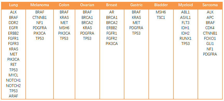 產品特性: 1. 樣本來源于臨床分離建立的細胞系,非常接近臨床病人的特性; 2. 泛癌種,涉及多種腫瘤相關的基因:肺癌、乳腺癌、結直腸癌、胰腺癌、血液腫瘤、胃癌等等,部分基因羅列如下: