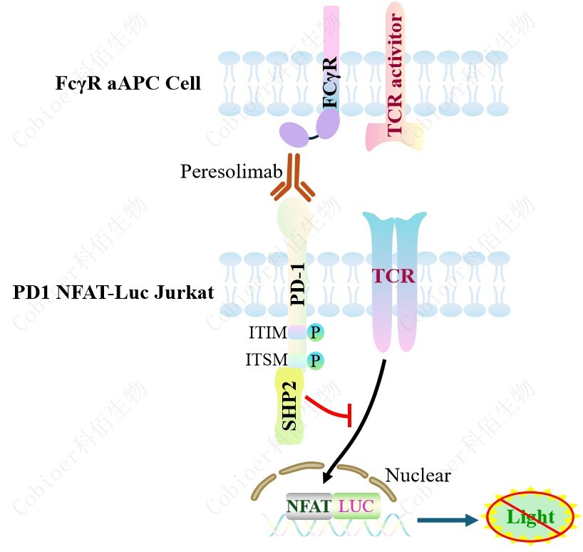 PD1 NFAT-Luc Jurkat 報(bào)告基因藥靶模型很好的模擬了體內(nèi) PD1&PDL1/PDL2 的信號(hào)轉(zhuǎn) 導(dǎo)過程,原理見下圖所示。![]() ![]() Figure 1. PD1 NFAT-Luc Jurkat 細(xì)胞模型原理圖 |