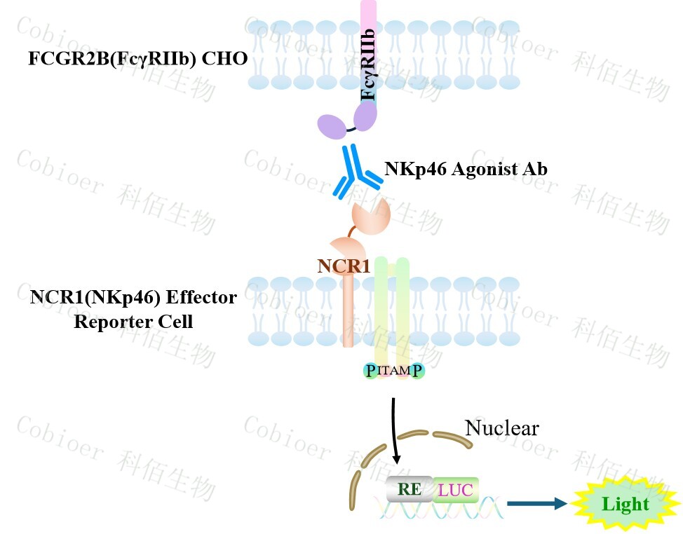 NCR1(NKp46) Effector Reporter 報(bào)告基因藥靶模型很好的模擬了體內(nèi) NKp46 的信號(hào)轉(zhuǎn) 導(dǎo)過(guò)程,原理見(jiàn)下圖 所示。![]() Figure 1. NCR1(NKp46) Effector Reporter 細(xì)胞模型原理圖