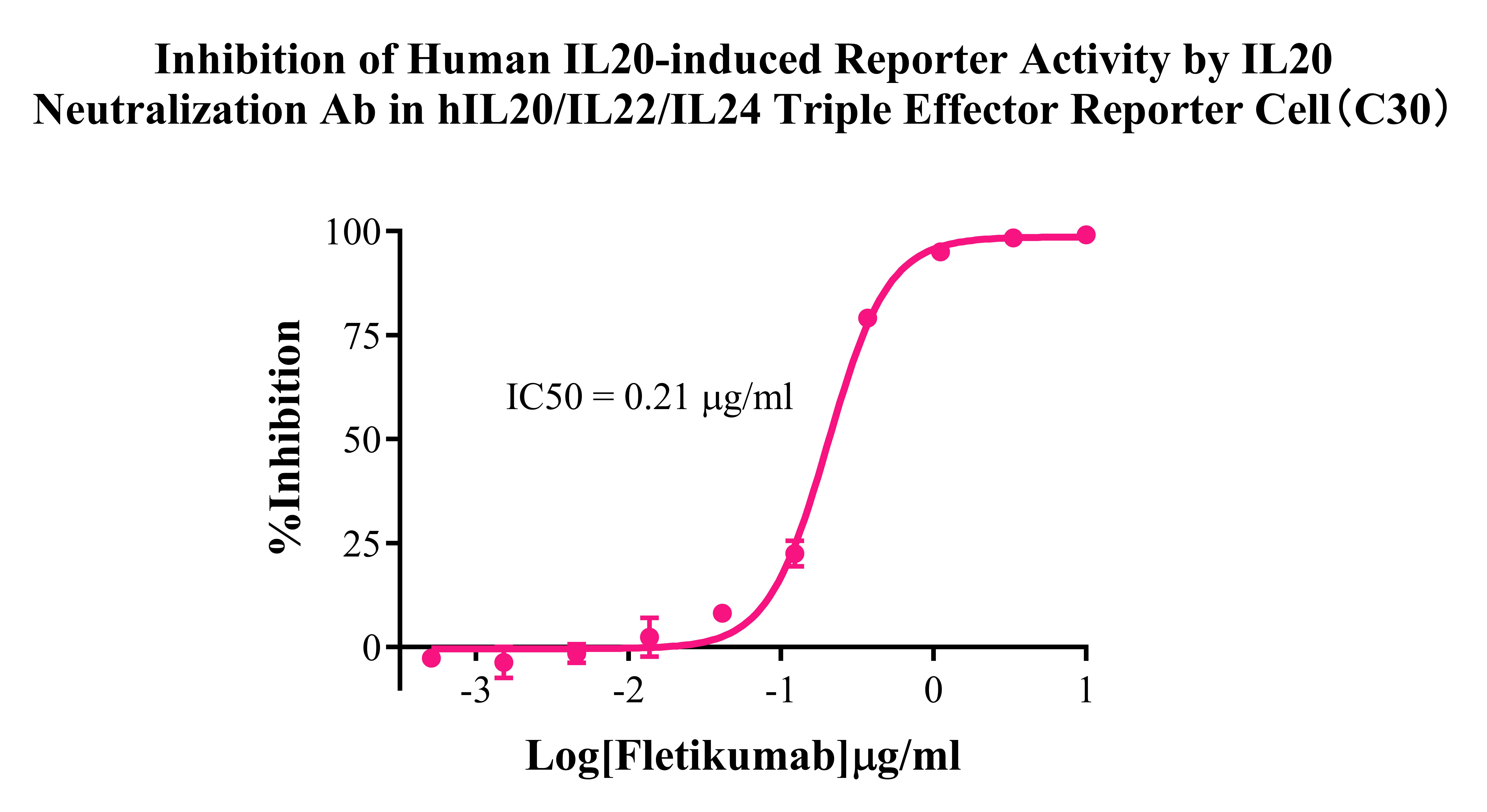 IV. Representative Data Figure 2. Recombinant hIL20/IL22/IL24 Triple Effector Reporter Cell stably expressing IL22Rα. Figure 3. Dose Response of Ligands in hlL20/IL22/lL24 Triple Effector Reporter Cell(C30). Figure 4. Inhibition of Human lL22-induced Reporter Activity by lL22Ra Blocking Ab or lL22 Neutralization Ab in hIL20/IL22/IL24 Triple Effector Reporter Cell(C30). Figure 5. Inhibition of Human lL20-induced Reporter Activity by lL20 Neutralization Ab in hlL20/IL22/IL24 Triple Effector Reporter Cell(C30). |