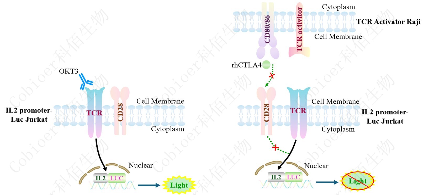 IL2 promoter-Luc Jurkat 報告基因藥靶模型很好的模擬了體內(nèi) IL2 的信號轉(zhuǎn)導(dǎo)過程,原 理見下圖所示。![]() |