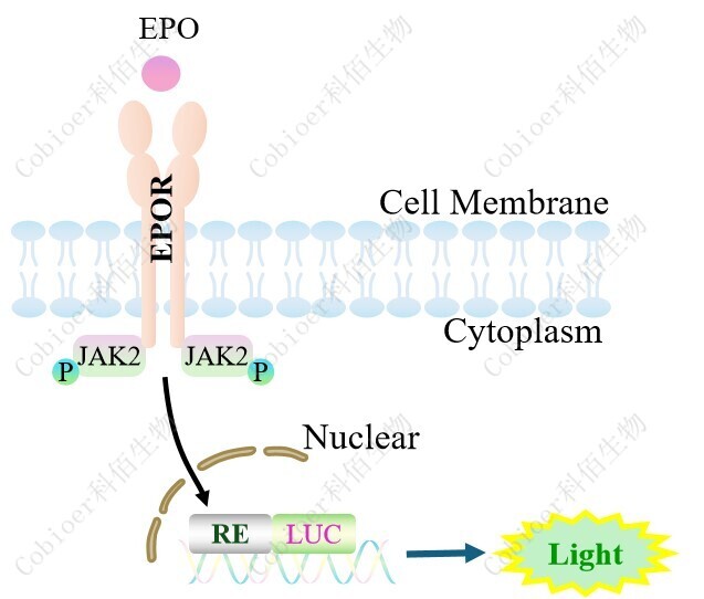 EPO Effector Reporter Cell 報(bào)告基因藥靶模型很好的模擬了體內(nèi) EPO&EPOR 的信號(hào)轉(zhuǎn) 導(dǎo)過(guò)程,原理見(jiàn)下圖所示。![]() Figure 1. EPO Effector Reporter Cell 細(xì)胞模型原理圖 |