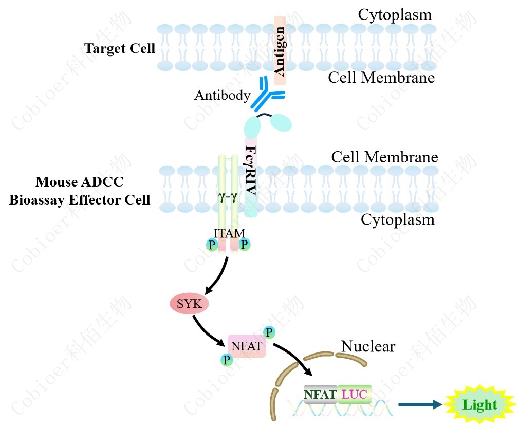 Mouse ADCC Bioassay Effector Cell 報(bào)告基因藥靶模型很好的模擬了體內(nèi) ADCC 的信號(hào)轉(zhuǎn)導(dǎo)過程,原理見下圖所示。 Figure 1. Mouse ADCC Bioassay Effector Cell 模型原理圖 |