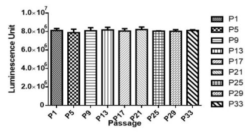 Figure. Stablity test results. NCI-H1703-Luc cells showed at least 32 passage stability with similar luminescence unit. |