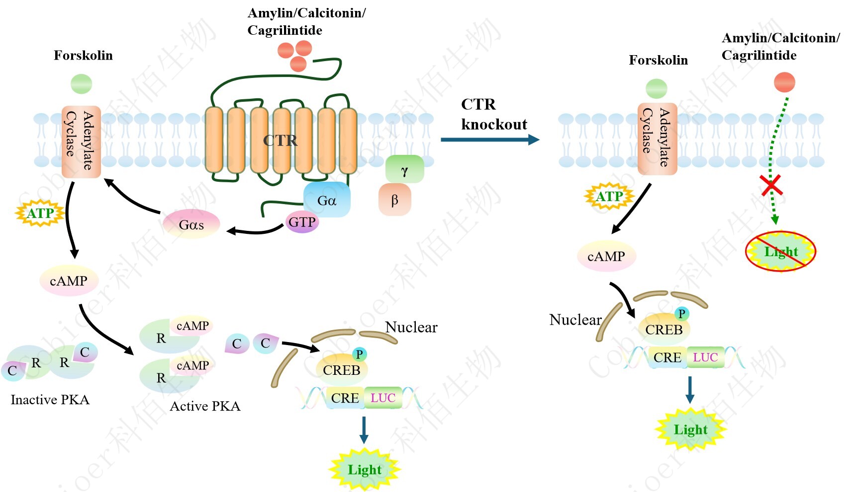 CTR-KO CRE-Luc HEK293 藥靶模型細(xì)胞可以用于 CTR 激動(dòng)劑的選擇性檢測(cè)評(píng)價(jià),以 確定候選激動(dòng)劑是否為 CTR 的特異性激動(dòng)劑,原理見下圖所示。
