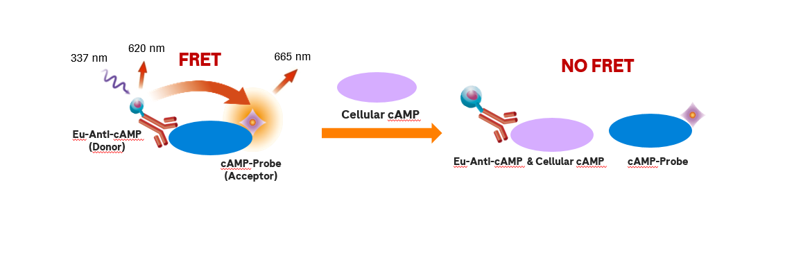 Cellular cyclic AMP Detection KIT是一種競(jìng)爭(zhēng)性的檢測(cè)技術(shù),檢測(cè)細(xì)胞內(nèi)cAMP的量。藥物同貼壁細(xì)胞或者懸浮細(xì)胞共處理后,能通過此KIT檢測(cè)出藥物對(duì)細(xì)胞的作用。 檢測(cè)原理采用TR-FRET檢測(cè)技術(shù)。細(xì)胞內(nèi)天然的cAMP同cAMP-Probe競(jìng)爭(zhēng)性結(jié)合Eu -Anti-cAMP。最終檢測(cè)出來的信號(hào)與樣本中cAMP的濃度成反比。 熒光比值665nm/620nm可以消除背景信號(hào)的干擾,意味著檢測(cè)不受實(shí)驗(yàn)培養(yǎng)基條件(例如培養(yǎng)基、血清、生物素、有色化合物等)的影響。 |