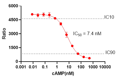 測(cè)試標(biāo)準(zhǔn)品的反應(yīng)曲線,以確定實(shí)驗(yàn)室中Stimulation Buffer或者細(xì)胞培養(yǎng)基的檢測(cè)線性動(dòng)態(tài)范圍。這還將驗(yàn)證實(shí)驗(yàn)中是否產(chǎn)生了預(yù)期的 S/B 和 cAMP的IC50值。 特別是IC10 和 IC90的數(shù)值將在實(shí)驗(yàn)中非常有用,可以用于優(yōu)化細(xì)胞系的細(xì)胞密度。