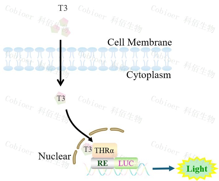 THRA Luciferase Reporter HEK293,是由 THRA 調(diào)控并表達(dá) Luc 熒光素 酶報(bào)告基因的 HEK293 細(xì)胞。甲狀腺激素(T3/T4)是一種有效的甲狀腺激素,主要通過(guò)結(jié) 合 TRs 發(fā)揮作用,調(diào)控基因表達(dá)和細(xì)胞功能,原理見下圖所示。 ![]() Figure 1. THRA Luciferase Reporter HEK293 原理示意圖