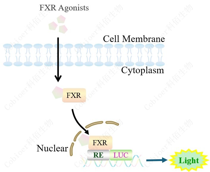 FXR Reporter Cell 報告基因細胞,在由調控因子調控并表達報告基因的 重組細胞上,穩(wěn)定表達人 FXR。CDCA,GW4064 和 WAY-362450 是 FXR 的激活劑,原理見下圖所示。![]() Figure 1. FXR Reporter Cell 細胞原理示意圖 |