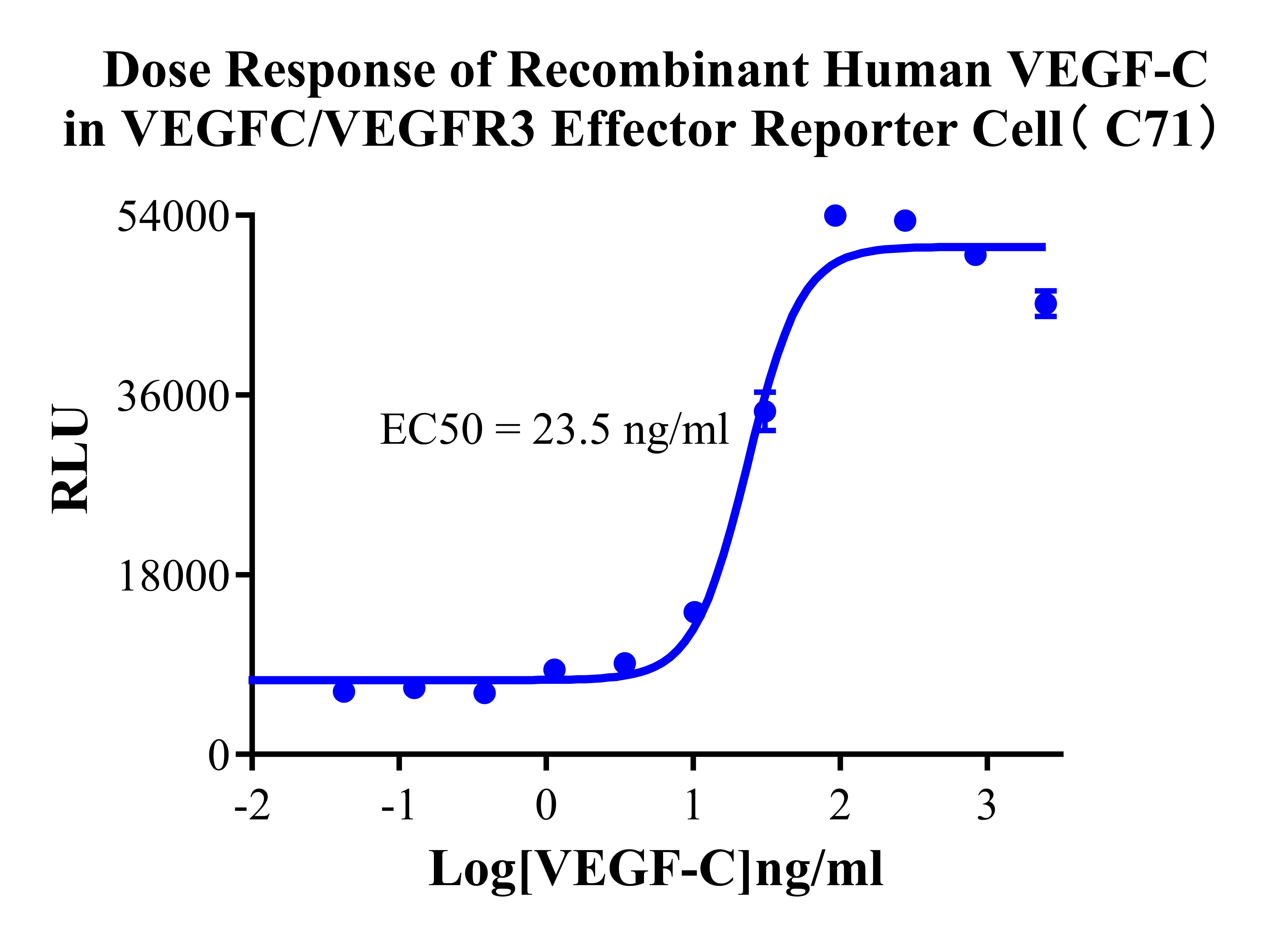 VEGF 又稱血管通透性因子(VPF),是一種二聚體糖蛋白,與細(xì)胞表面的 VEGF 受 體(VEGFR)結(jié)合,從而激活細(xì)胞內(nèi)酪氨酸激酶,啟動一系列參與血管生成和血管生成的 信號級聯(lián)反應(yīng)事件。在哺乳動物中,VEGF 家族有 5 個成員:VEGFA、VEGFB、VEGFC、 VEGFD 和胎盤生長因子(PGF)。VEGFC 是分泌型二聚體糖蛋白(全長 58 kDa),需經(jīng) 蛋白酶(如 ADAMTS3)切割激活為 21 kDa 成熟肽以增強(qiáng)其生物活性,其核心功能是主導(dǎo) 淋巴管生成,在發(fā)育期廣泛表達(dá)于心、腎、腦間充質(zhì),成年后主要富集于淋巴管內(nèi)皮周細(xì) 胞、巨噬細(xì)胞及腫瘤微環(huán)境,通過驅(qū)動胚胎淋巴系統(tǒng)發(fā)育和成體淋巴重塑發(fā)揮關(guān)鍵作用。 VEGF 家族成員以重疊的方式結(jié)合三種受體酪氨酸激酶(VEGFR1、VEGFR2 和 VEGFR3)。這些受體都屬于跨膜酪氨酸激酶受體,包括三個主要區(qū)域,即細(xì)胞外區(qū)域、 跨膜區(qū)域和細(xì)胞內(nèi)羧基端。當(dāng) VEGF 與其受體結(jié)合時,形成同源二聚體復(fù)合物,使其蛋白 構(gòu)象發(fā)生改變,酪氨酸殘基發(fā)生自磷酸化并將信號傳導(dǎo)到下游。 |