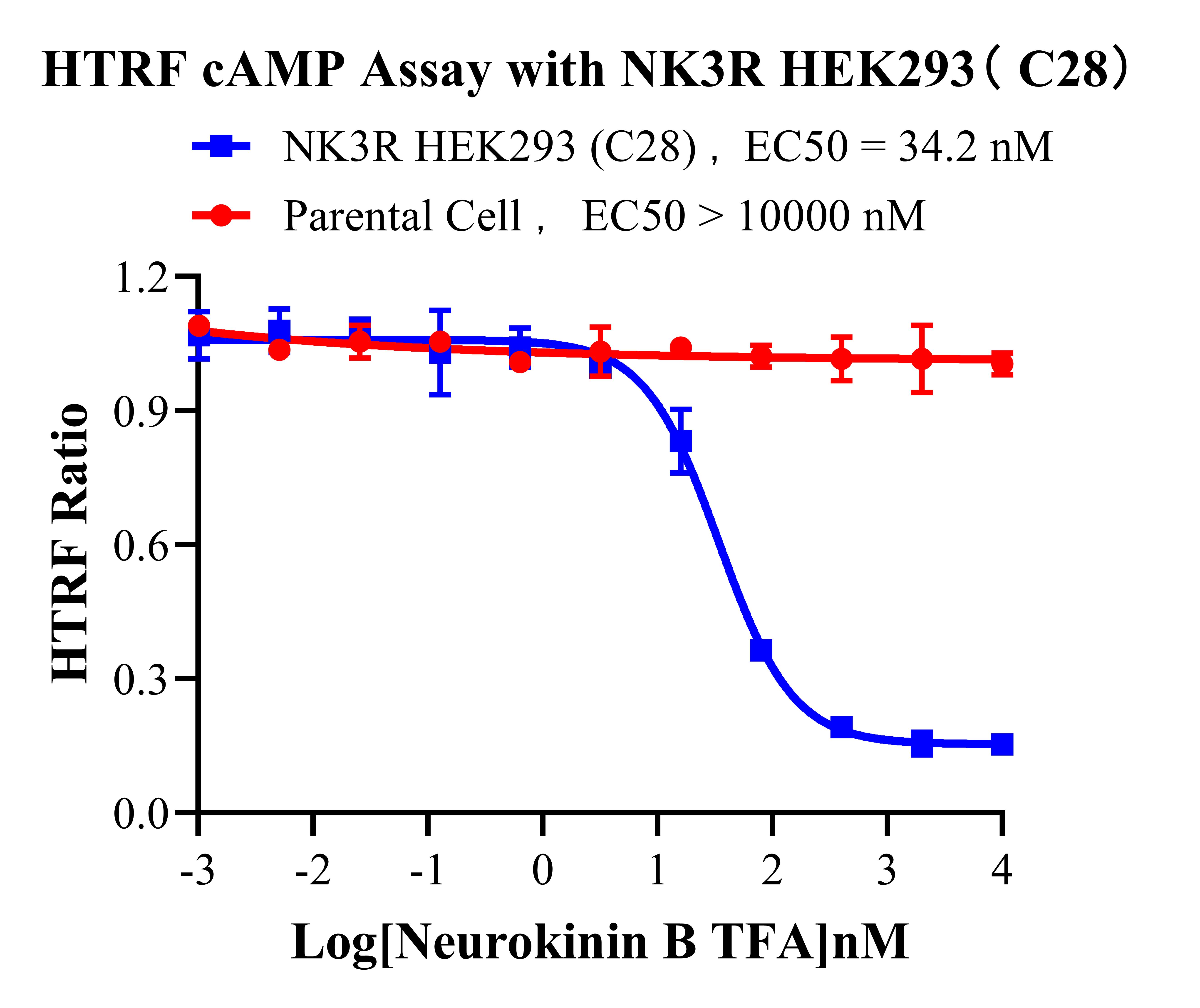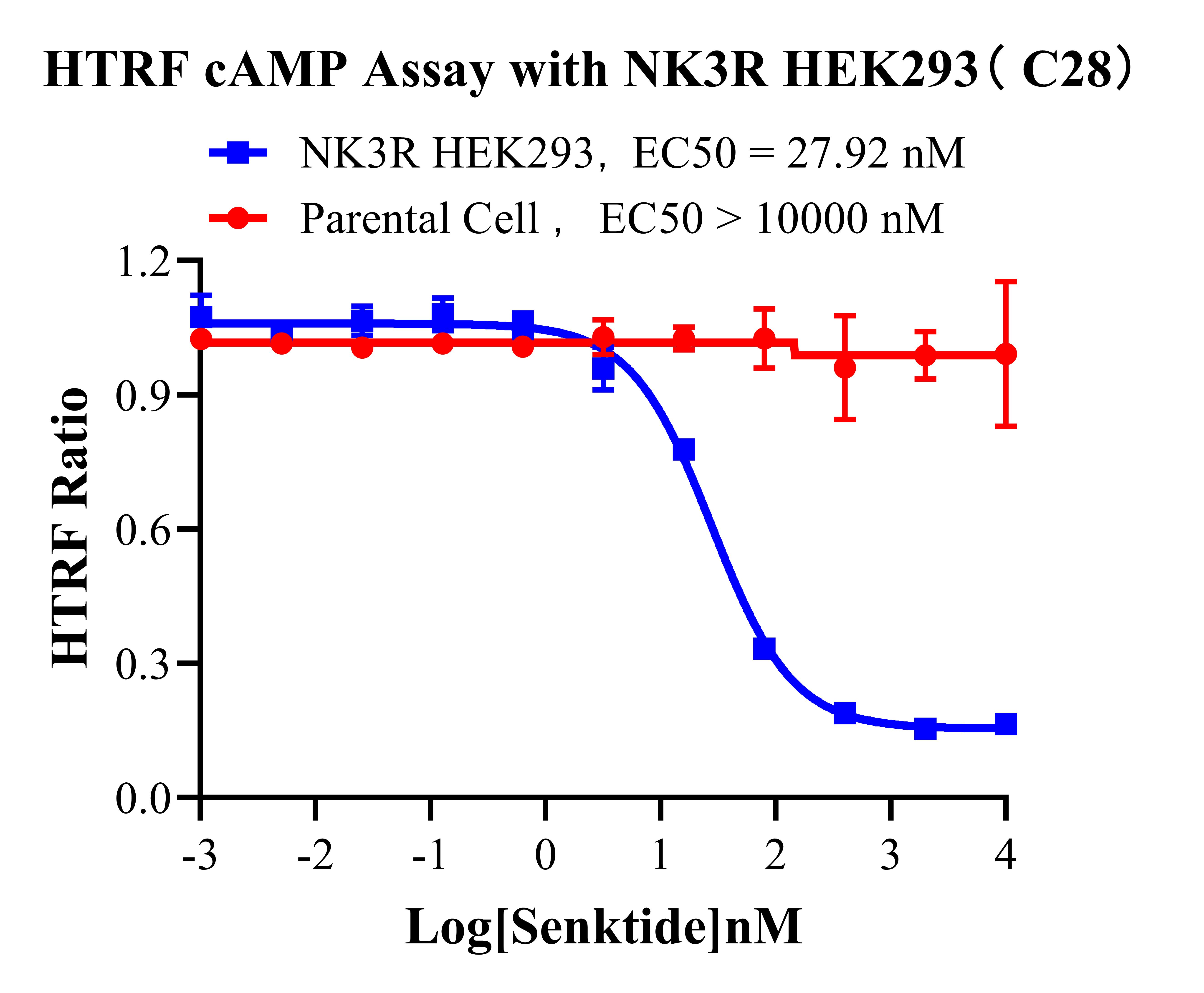 cAMP 在 G 蛋白偶聯(lián)受體(GPCR)信號(hào)轉(zhuǎn)導(dǎo)中是一種關(guān)鍵的第二信使。當(dāng)配體結(jié)合 到 GPCR,構(gòu)象發(fā)生變化,激活受體接著激活 G 蛋白,Gs 的激活導(dǎo)致腺苷酸環(huán)化酶調(diào)控 cAMP 的升高。NK3R HEK293 細(xì)胞藥靶模型很好的模擬了體內(nèi) NK3R 的信號(hào)轉(zhuǎn)導(dǎo)過(guò)程,原 理見(jiàn)下圖所示。