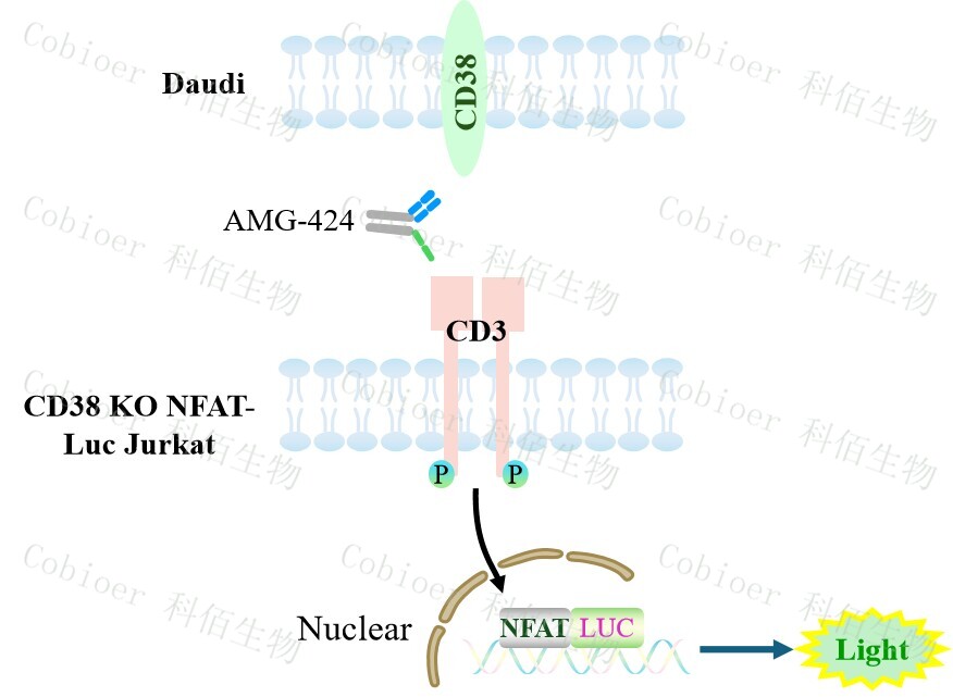 CD38 KO NFAT-Luc Jurkat Cell 報(bào)告基因藥靶模型通過報(bào)告基因的信號反映 T 細(xì)胞受體 (TCR)信號通路的激活水平,原理見下圖所示。![]() Figure 1. CD38 KO NFAT-Luc Jurkat Cell 細(xì)胞模型圖 |