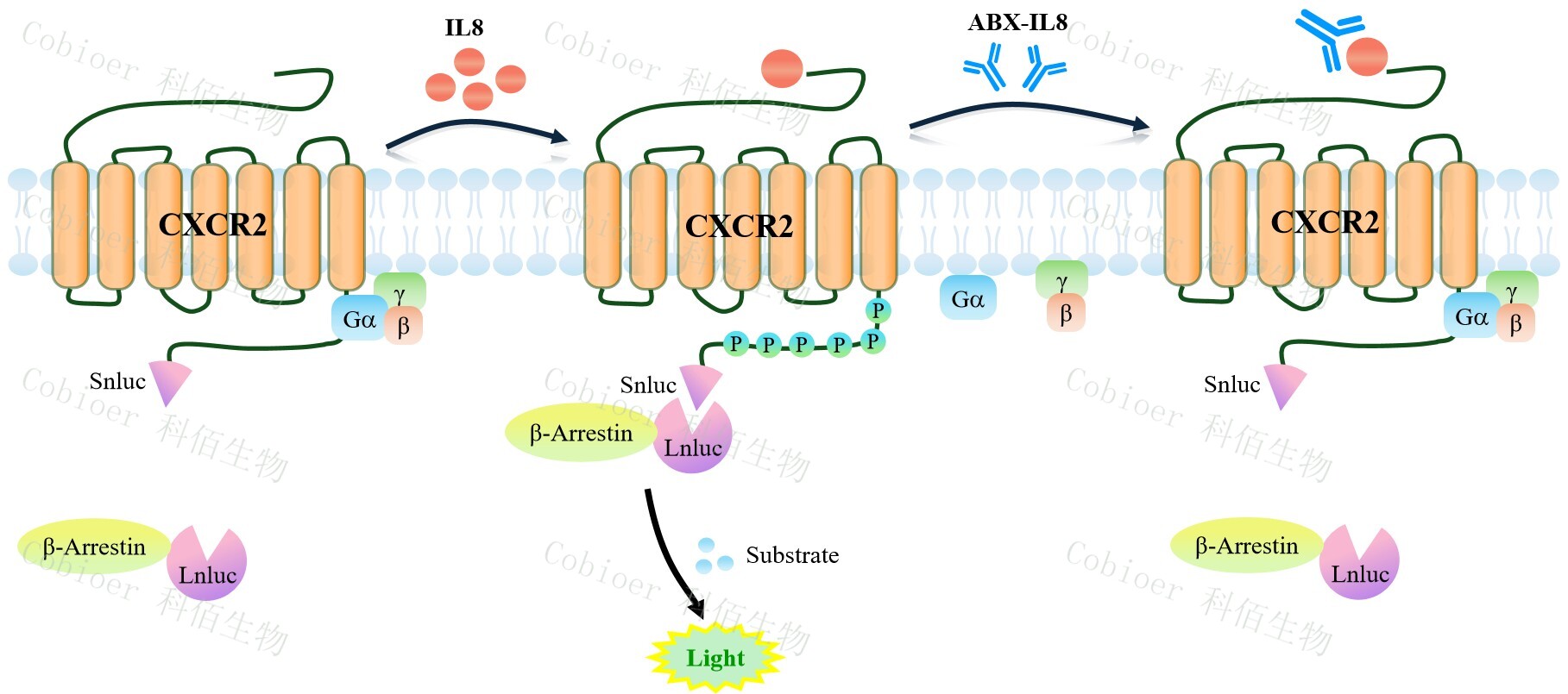 CXCR2 β-Arrestin CHO 報告基因藥靶模型很好的模擬了體內(nèi) CXCR2/β-Arrestin 的信號轉(zhuǎn)導(dǎo)過程,原理見下圖當(dāng)缺乏配體刺激時,β-Arrestin 不與 CXCR2 結(jié)合,融合β- Arrestin 的熒光素酶處于失活構(gòu)象,當(dāng) CXCR2 遭遇配體刺激時,融合熒光素酶報告基因的 β-Arrestin 被招募,使熒光素酶報告基因處于激活狀態(tài),加入其底物后發(fā)光信號增強。![]() Figure 1. CXCR2 β-Arrestin CHO 細(xì)胞模型原理圖 |