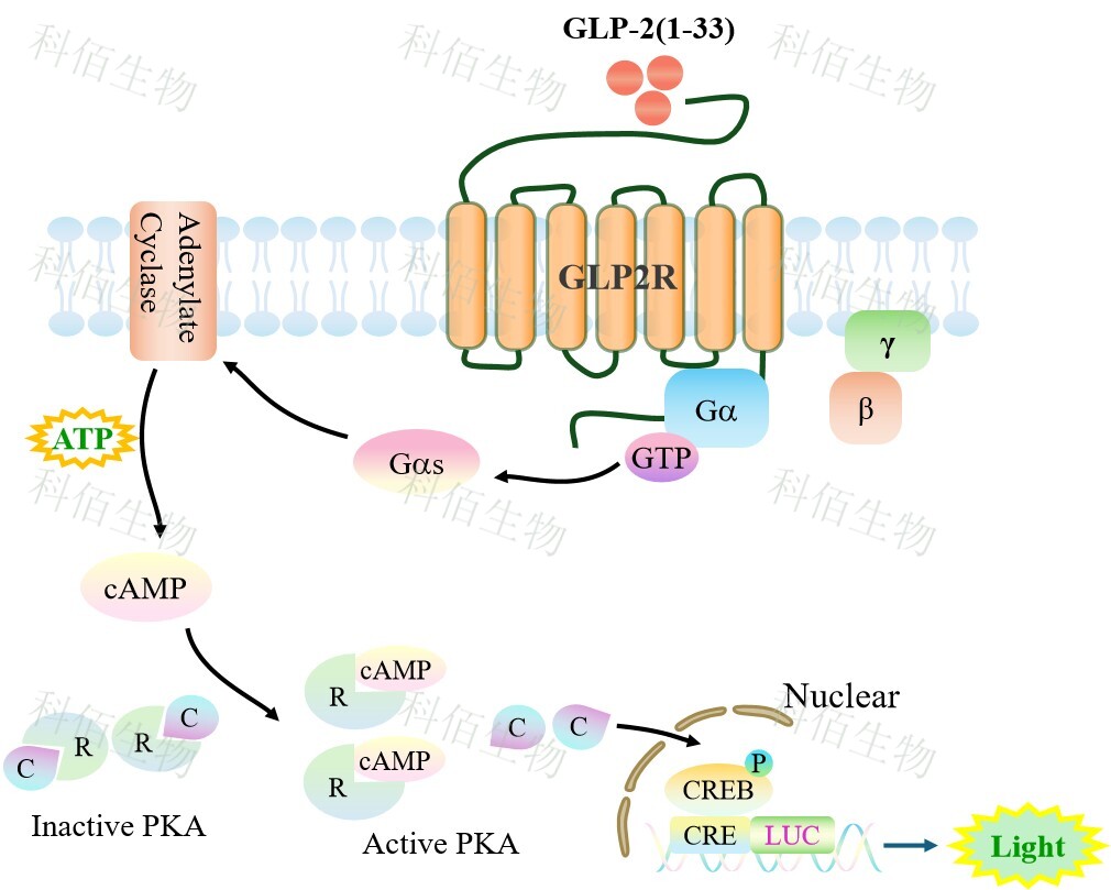 GLP2R CRE-Luc HEK293 報告基因藥靶模型很好的模擬了體內(nèi) GLP2R 的信號轉(zhuǎn)導(dǎo)過程,原理見下圖所示。