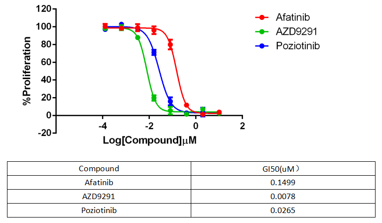 Figure 4. Anti-proliferation assay of three reference compounds on the EGFR Del19-T790M/BaF3 Stable Cell Line. |