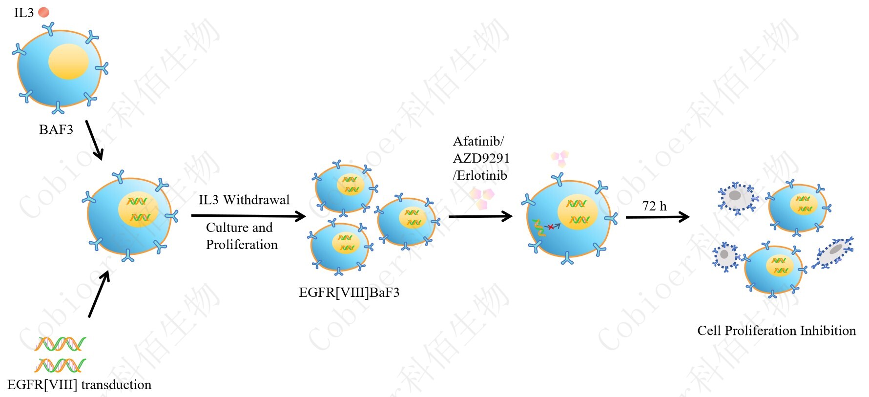 BaF3(小鼠原 B 細胞)的生長和增殖需要 IL-3 的維持。通過引入各種表達激酶的基因, 能作為 BaF3 的驅(qū)動基因,讓 BaF3 不再依賴 IL-3 而增殖,進而激酶基因成為 BaF3 增殖依 賴的驅(qū)動基因,用于評估小分子藥物對激酶的靶向抑制作用,原理及流程見下圖所示。