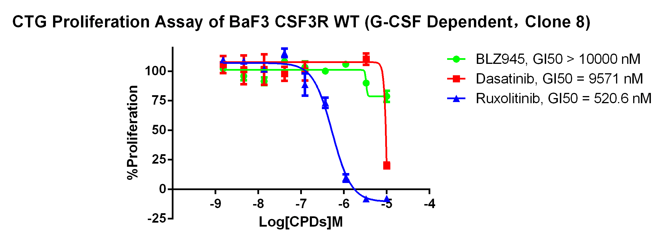 Figure 2. Anti-proliferation assay of three reference compounds on the CSF3R WT/BaF3.
