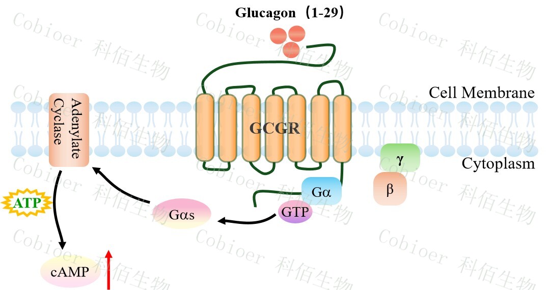 胰高血糖素是一種胰腺肽激素,作為胰島素的反調(diào)節(jié)激素,刺激葡萄糖通過肝臟釋放, 維持葡萄糖穩(wěn)態(tài)。GCGR 是一種 B 類 GPCR,最初被描述為與腺苷酸環(huán)化酶功能相連的胰 高血糖素結(jié)合體。它在維持葡萄糖穩(wěn)態(tài)中起關(guān)鍵作用,因此被認(rèn)為是治療糖尿病的一個(gè)有 價(jià)值的靶點(diǎn)。 GCGR 的天然配體是胰高血糖素。胰高血糖素與受體結(jié)合激活 Gs 蛋白,從而激活腺苷 酸環(huán)化酶。GCGR 受體與天然配體胰高血糖素結(jié)合調(diào)節(jié)體內(nèi)葡萄糖穩(wěn)態(tài),是Ⅱ型糖尿病的 重要藥物靶點(diǎn)。 |