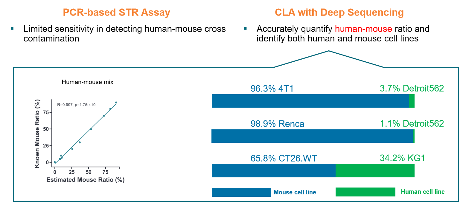 基于靶向測(cè)序600+ SNP位點(diǎn)及染色體片段的深度測(cè)序(3000X覆蓋)與智能分析,深度測(cè)序(CLA with Deep Sequencing)技術(shù)可同步實(shí)現(xiàn)細(xì)胞系高精度鑒定、微量污染檢測(cè)(1%靈敏度)及多維度遺傳解析。