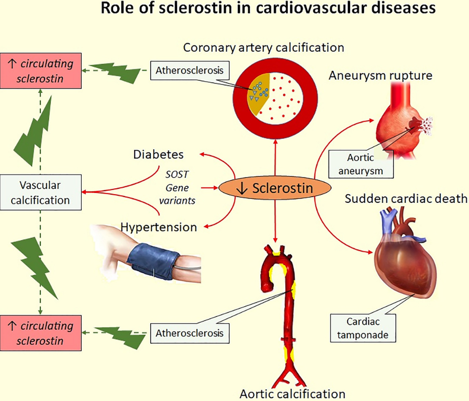 硬化蛋白在廣泛分布于心血管系統(tǒng)的VSMC (vascular smooth muscle cell, VSMC)中表達,并與許多血管疾病有關。動物研究表明,在腹主動脈瘤AAA、動脈粥樣硬化和心臟破裂中存在硬化蛋白缺乏,并發(fā)現(xiàn)其在動脈鈣化部位上調(diào)。有報告指出,導致動脈硬化蛋白表達降低的基因變異增加了高血壓和糖尿病的患病率,并提高了心血管事件的風險。