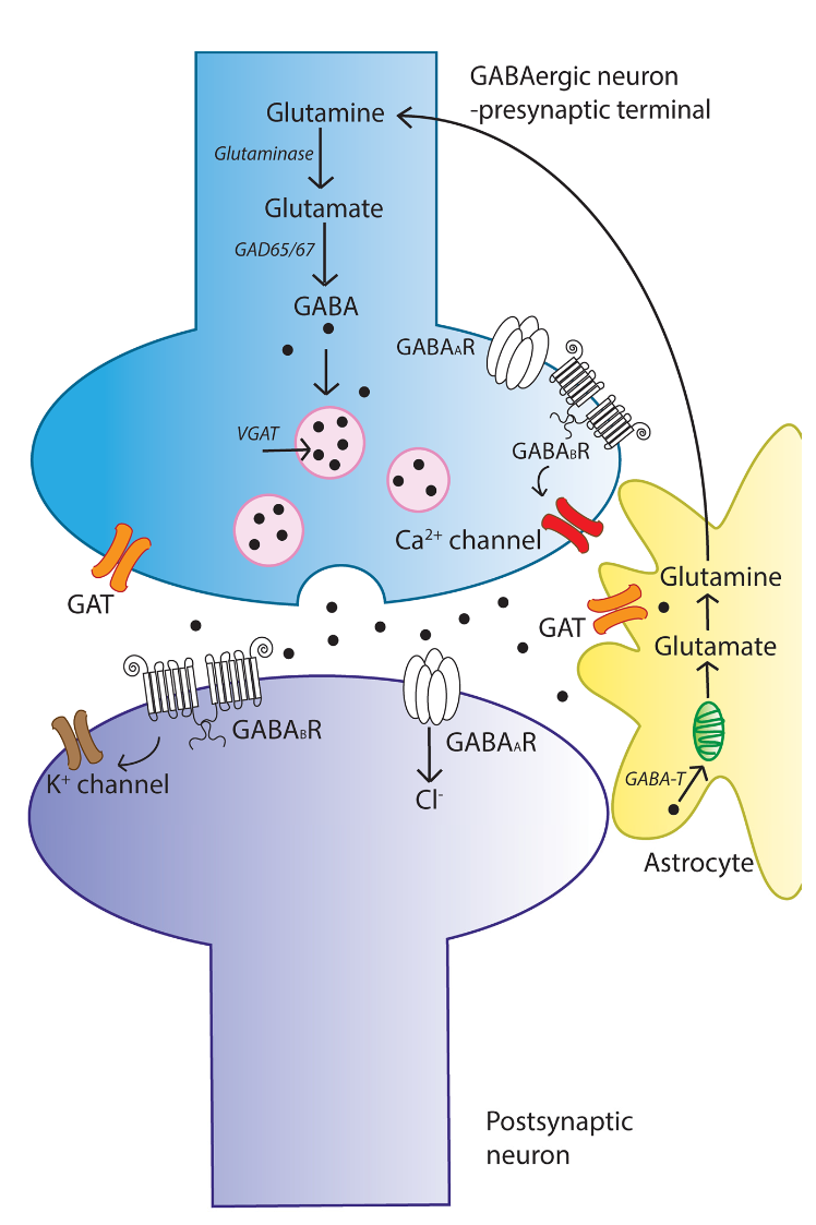 GABA的合成是通過谷氨酸酸脫羧酶(GAD)對L-谷氨酸的α-脫羧作用進行的,并依賴于輔酶吡哆醛-5'-磷酸(維生素B6的一種維生素)。GAD存在兩種主要的亞型:65 kDa亞型(GAD65)和67 kDa亞型(GAD67)。GAD65是哺乳動物大腦中表達的GAD的主要亞型,主要定位于突觸體的軸突末端,容易與質膜相互作用,而GAD67則更廣泛地分布于細胞的細胞質中。兩種GAD亞型的差異分布與細胞內兩種GABA的存在相吻合,一種存在于囊泡中,另一種存在于細胞質中,它們通過不同的機制釋放。GABA通過囊泡GABA轉運蛋白(vGAT)的作用被募集到突觸囊泡中。在膜去極化后,GABA被釋放到突觸中,并可與突觸后膜上的嗜離子性GABA受體(GABAAR)或代謝性GABB受體(GABABR)結合,從而抑制突觸后神經元。釋放的GABA通過膜結合的GABA轉運體(GATs)從突觸中清除,在星形膠質細胞中,GABA被循環(huán)進入突觸囊泡或被線粒體吸收,在線粒體中被GABA轉氨酶(GABA- t)代謝為谷氨酰胺供神經元攝取。