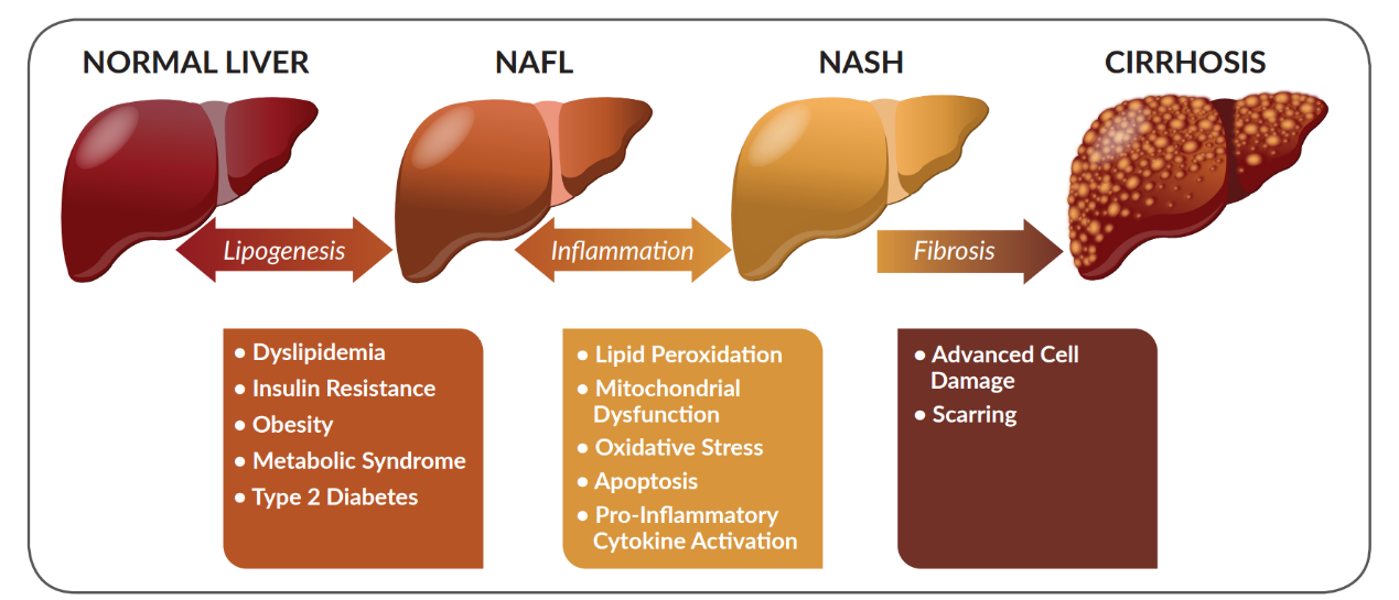 非酒精性脂肪性肝炎(NASH)是非酒精性脂肪肝?。∟AFLD)的嚴(yán)重形式,伴隨肝臟炎癥、脂肪堆積和纖維化,可進(jìn)展為肝硬化甚至肝癌。全球約 25% 成人患有非酒精性脂肪肝?。∟AFLD),其中20%-30% 會進(jìn)展為非酒精性脂肪性肝炎(NASH)