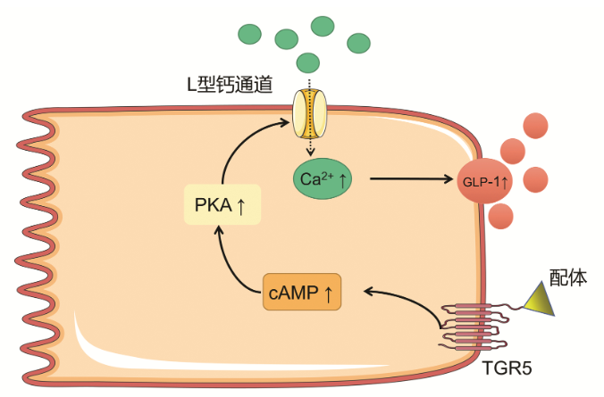 TGR5在維持葡萄糖穩(wěn)態(tài)和胰島素敏感性方面上的效果已得到廣泛證明。例如,使用TGR5激動劑6α-乙基-23(S)-甲基-膽酸(6α-ethyl-23(S)-methyl-cholic acid,INT-777)可以提高肥胖小鼠的胰島素敏感性,7-硫酸膽酸以TGR5依賴性方式增加胰島素抵抗小鼠的葡萄糖耐量等。機體各組織的TGR5可通過不同的分子機制參與血糖代謝的調(diào)節(jié)。TGR5對于血糖代謝的作用,主要與腸促胰島素釋放相關(guān),通過刺激腸內(nèi)分泌L細(xì)胞分泌GLP-1來實現(xiàn)。既往研究發(fā)現(xiàn),GLP-1可促進胰島素分泌,促進胰島β細(xì)胞存活和增殖,抑制細(xì)胞凋亡,并且可有效刺激2型糖尿病患者的胰島素分泌并降低血糖。早期觀點認(rèn)為TGR5被激活后刺激腸內(nèi)分泌L細(xì)胞內(nèi)cAMP水平增加,線粒體氧化磷酸化增加,ATP/ADP比例增加,導(dǎo)致ATP依賴性鉀離子通道(KATP)關(guān)閉,開放鈣離子通道,促進鈣離子內(nèi)流,釋放GLP-1。但后續(xù)大量研究驗證了GLP-1的分泌確實與cAMP升高,胞內(nèi)鈣離子升高有關(guān),但與ATP依賴性鉀離子通道無關(guān)。Brighton等的實驗進一步驗證了GLP-1分泌與L細(xì)胞內(nèi)的cAMP和Ca2+濃度變化有關(guān),并且說明了該作用主要由位于基底外側(cè)L細(xì)胞膜上的TGR5介導(dǎo)。近年來,Goldspink等發(fā)現(xiàn)腸L細(xì)胞上的TGR5被激活后,通過cAMP/PKA途徑,開放了L型Ca2+通道,促進Ca2+內(nèi)流,引發(fā)GLP-1分泌。