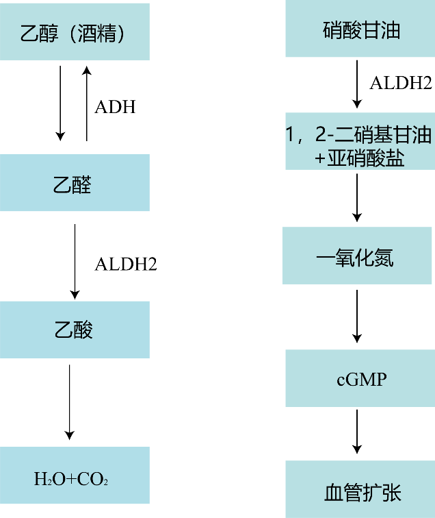 ALDH2(acetaldehyde dehydrogenase 2),線粒體乙醛脫氫酶2,位于第12號(hào)染色體的12q24.2位置,全長(zhǎng)43,438bp,共有15個(gè)外顯子,編碼由517個(gè)氨基酸殘基組成的蛋白質(zhì)。ALDH2是人體催化硝酸甘油生物轉(zhuǎn)化的主要途徑,該酶同時(shí)具有脫氫酶和酯酶的催化活性,其酯酶活性可以通過(guò)將硝酸甘油脫硝產(chǎn)生NO,進(jìn)而引起血管擴(kuò)張。